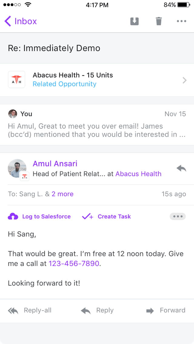 Immediately analyzes every email, and presents any relevant deal context from Salesforce and beyond. That way, you always have all the information you need, where you need it.
